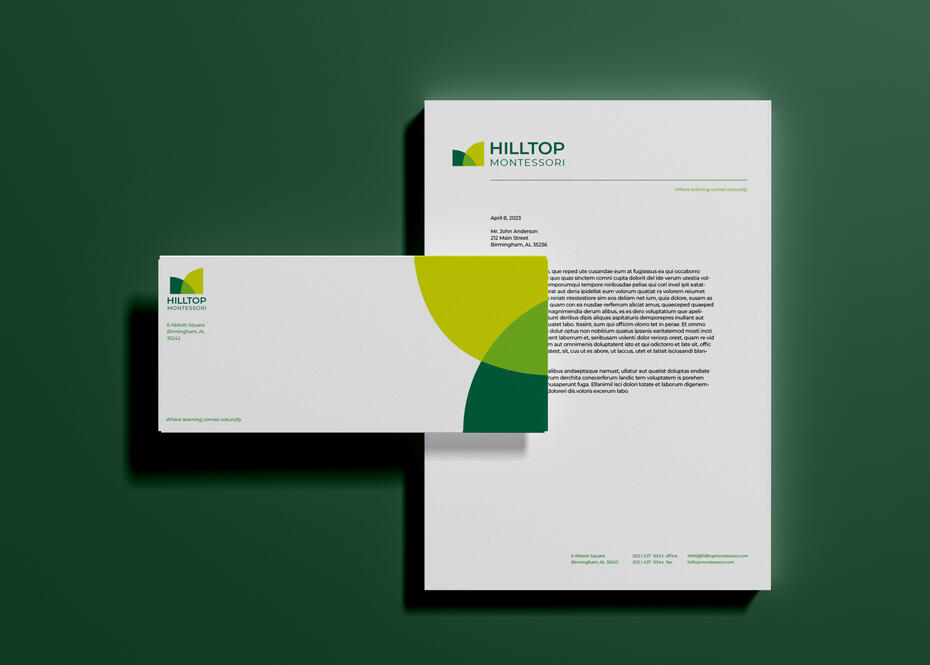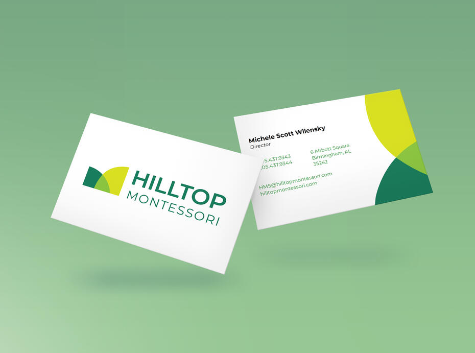 I created an identity for Hilltop Montessori Schools that reflected the alternative montessori style learning and focused on conveying ideas of collaboration, creativity, and growth.The two abstract shapes overlap to represent collaboration, and they come together to make a new color to reflect the creation of a new idea. Shades of green and an upward diagonal represent growth.