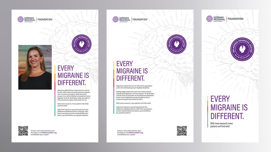 During my time with Lindsey + Asp, I was the creative lead on the Norman Regional Healthcare account. They needed some promotional materials for their fundraising campaign for migraine research, and they wanted to do patient testimonials. For this design, I wanted to focus on leaving negative space and creating a calm, clean look, without being too boring. These posters will be up in the clinic and the mailers will be sent out to the entire region!
