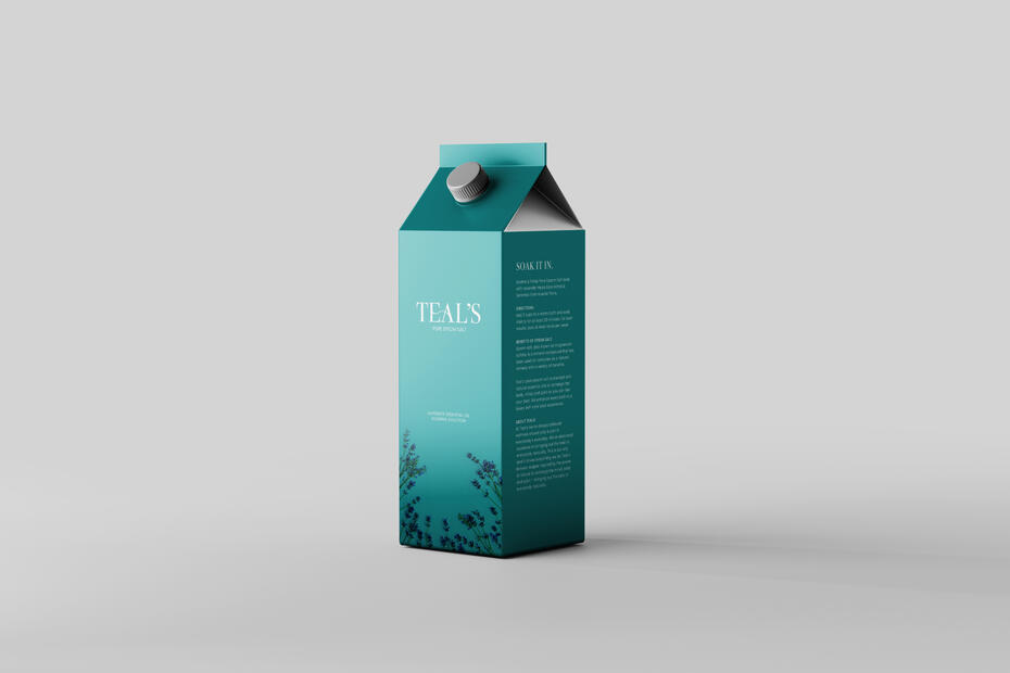 I rebranded Dr. Teal's Epsom salt to appeal more classy, elegant, and luxurious. It was important to me that I kept the typography and layout clean and simple. Dr. Teal's hasn't changed their branding since they launched in 2003, and it looks very medicinal, cold, and outdated. In my design, I wanted to convey the relaxation and calmness that the product provides.First off, I changed the previous blue to a teal to match the name. I dropped "Dr." to portray the brand as more of a self-care experience, less of a treatment for an ailment. I connected the E and A of Teal's with a calm wave to convey calming waters.I also changed the packaging of the product to be in a carton instead of a bag, because a paper carton is more eco-friendly than a plastic bag, which appeals to more modern audiences. The carton also has a screw top which allows for easier pouring straight into the bath.